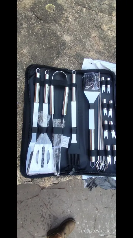 Grill like a pro anywhere. This complete stainless steel BBQ set includes all the essential tools for outdoor cooking, neatly packed in a portable storage case. Perfect for camping, picnics, tailgates, or backyard barbecues.